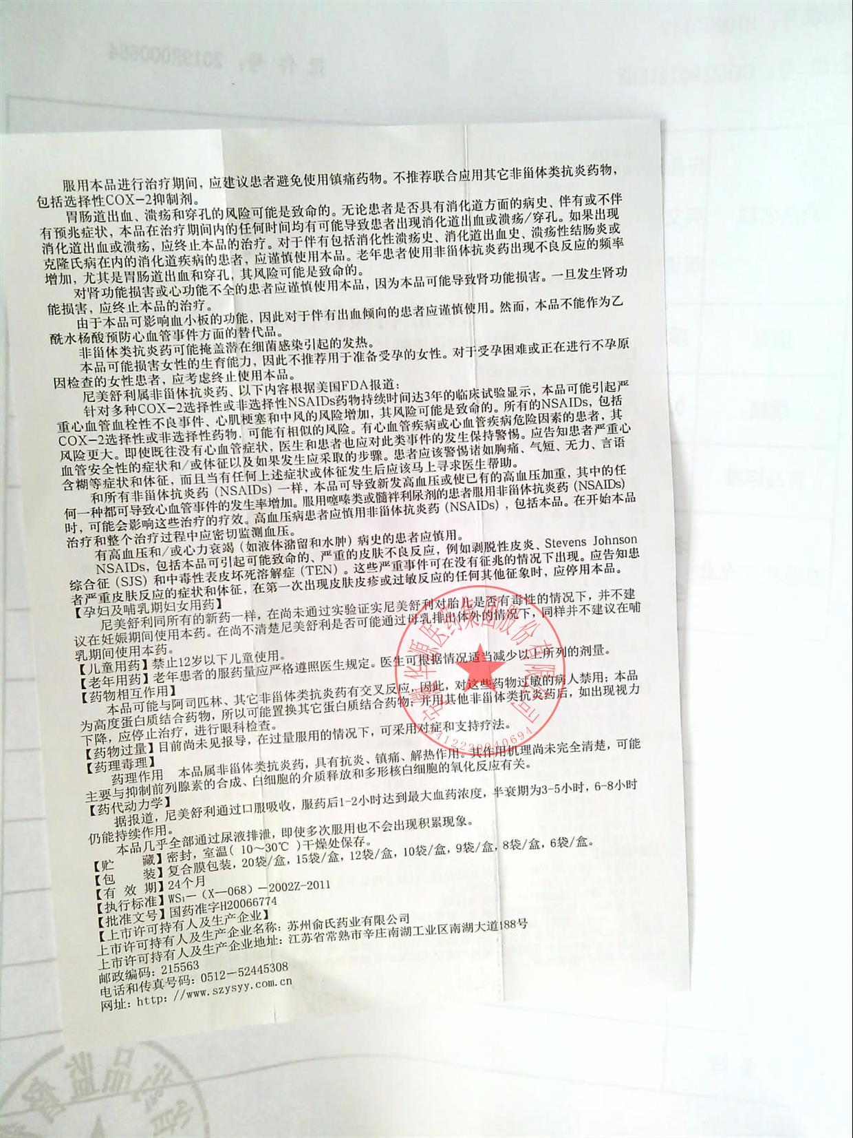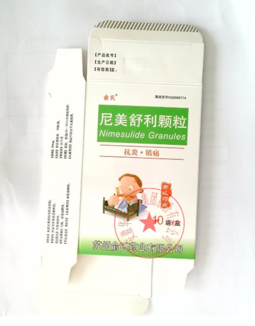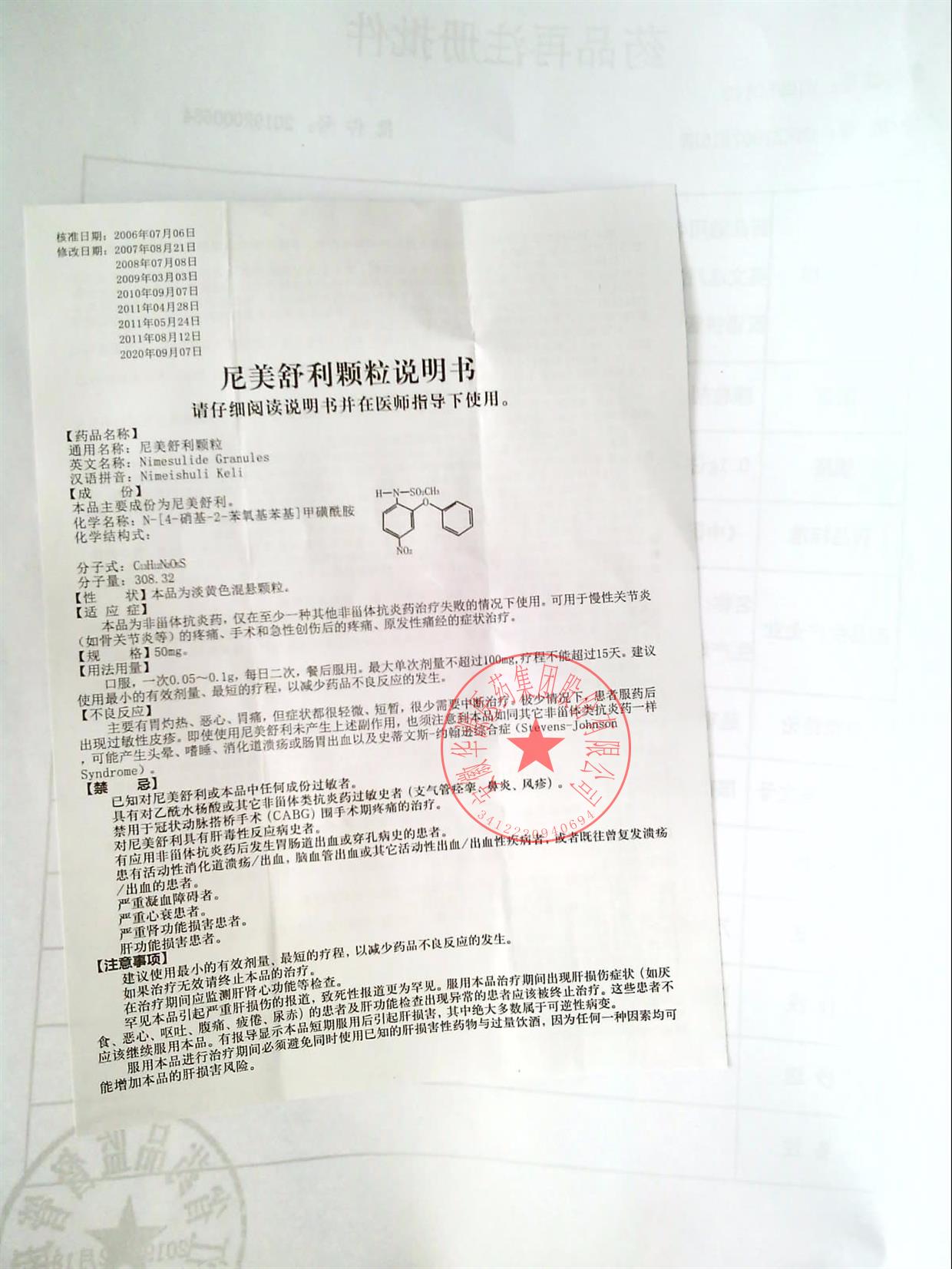 | 不良反应 | 主要有胃灼热、恶心、胃痛等,但症状轻微、短暂,很少需要中断治疗。极少情况下,患者服药后出现过敏性皮疹。即使使用尼美舒利未产生上述副作用,也须注意到本品如同其他非甾体类抗炎药一样,可能产生头晕、嗜睡、消化道溃疡或胃肠出血以及史蒂文斯-约翰逊综合症(Stevens-Johnson-Syndrome)。 |