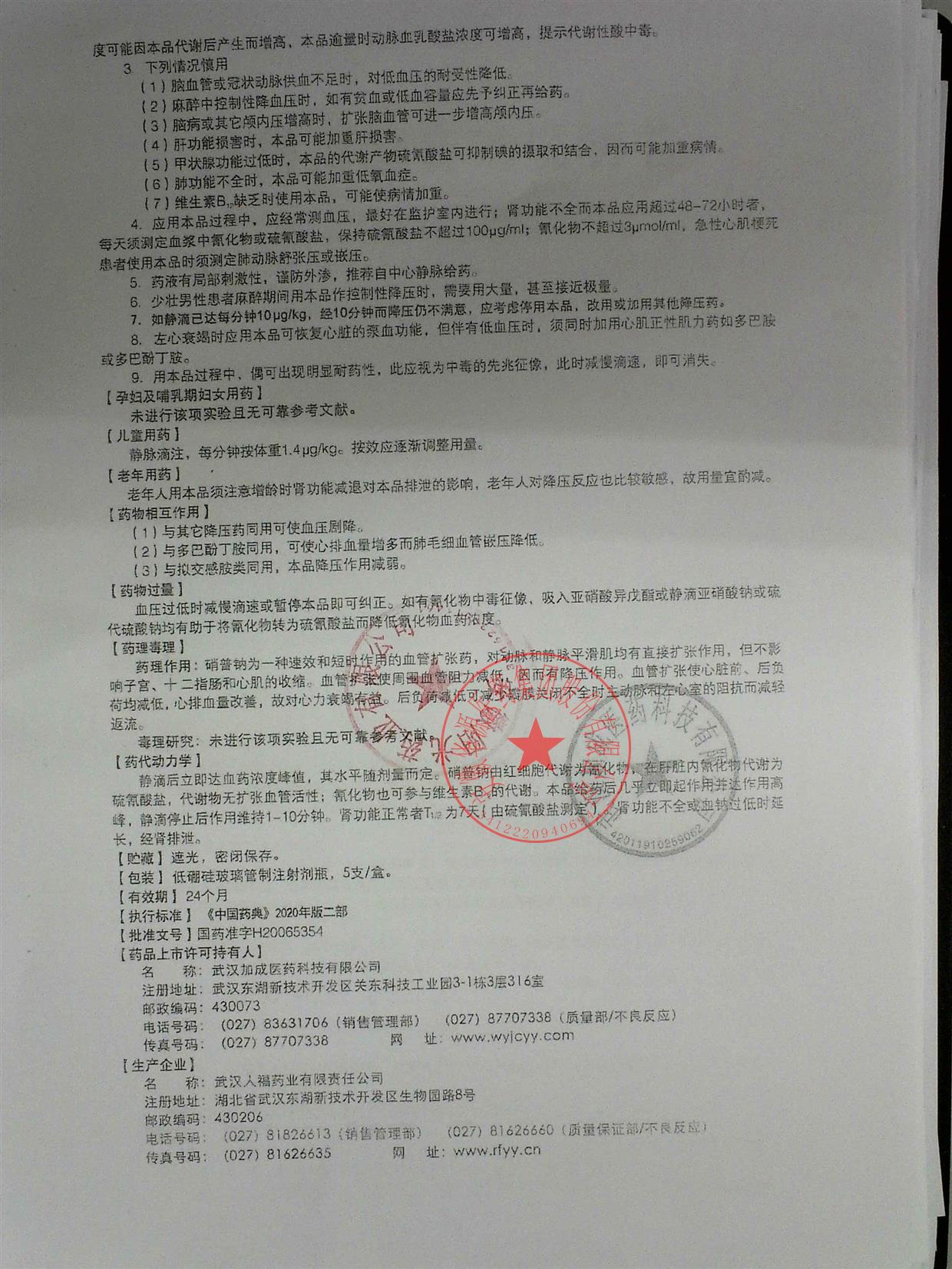 | 不良反应 | 短期应用适量不致发生不良反应。 1.本品毒性反应来自其代谢物氰化物和硫氰酸盐,氰化物是中间代谢物,硫氰酸盐为最终代谢物,如氯化物不能正常转化为硫氰酸盐,则硫氰酸亚盐浓度虽正常也可发生中毒。详见说明书。 |
