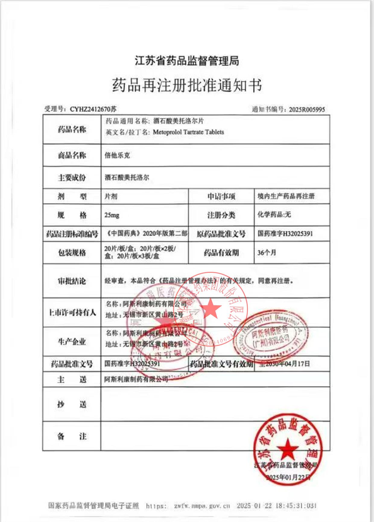 | 用法用量 | 口服。剂量应个体化,以避免心动过缓的发生。应空腹服药,进餐时服药可使美托洛尔的生物利用度增加40%。详见说明书。 |