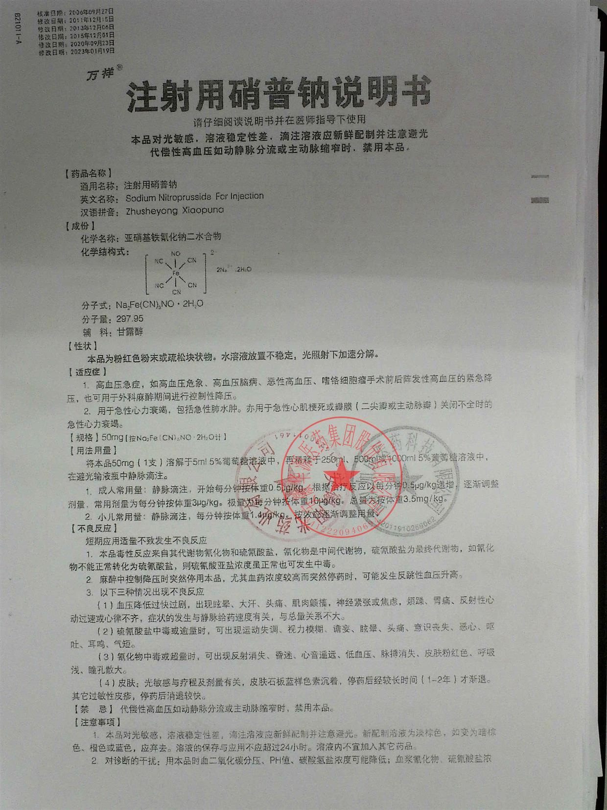 | 不良反应 | 短期应用适量不致发生不良反应。 1.本品毒性反应来自其代谢物氰化物和硫氰酸盐,氰化物是中间代谢物,硫氰酸盐为最终代谢物,如氯化物不能正常转化为硫氰酸盐,则硫氰酸亚盐浓度虽正常也可发生中毒。详见说明书。 |