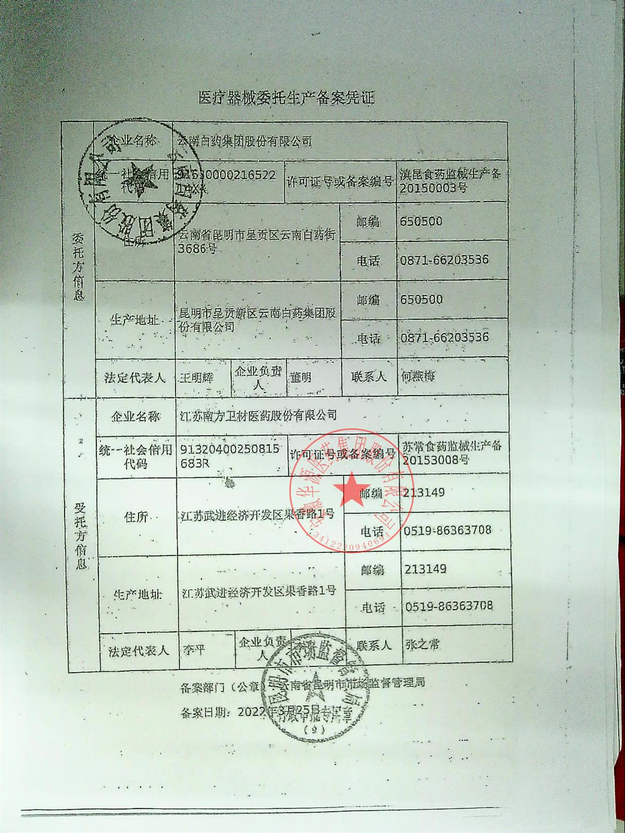 医疗器械生产许可证/备案凭证编号 | 滇昆食药监械生产备20150003号 |