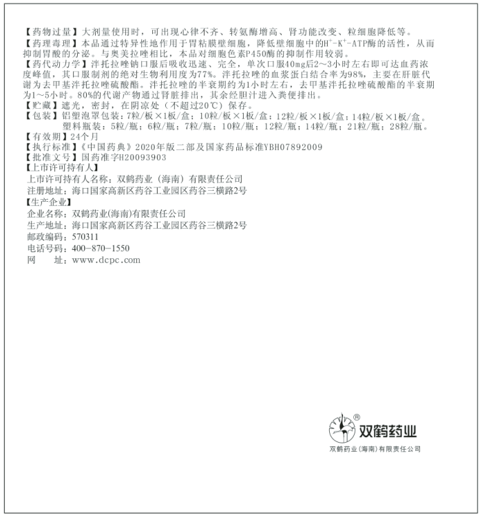 | 规格 | 40mg(以泮托拉唑计) |