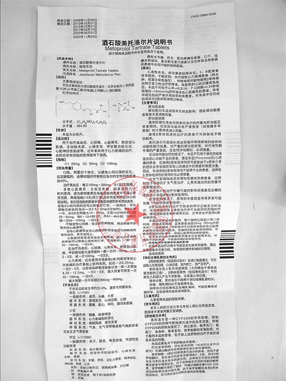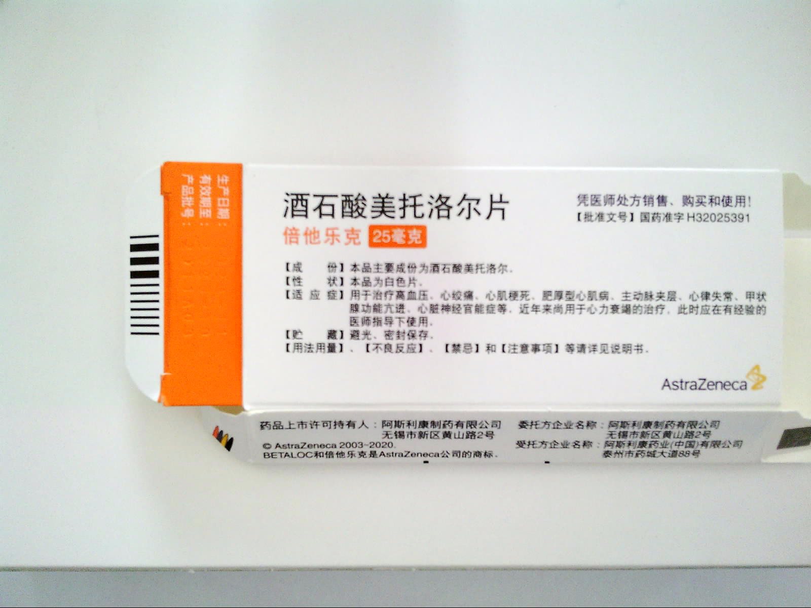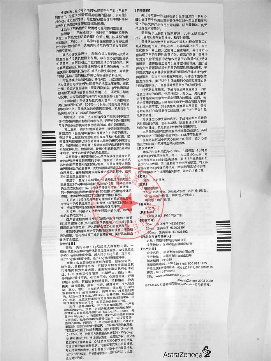 | 用法用量 | 口服。剂量应个体化,以避免心动过缓的发生。应空腹服药,进餐时服药可使美托洛尔的生物利用度增加40%。详见说明书。 |